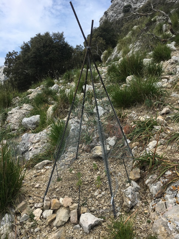 The CARE-MEDIFLORA team in the Balearic Islands (The Sóller Botanic Garden, SBG) started the population reinforcement of a natural population which has only three individuals remaining alive. This population is located in Cúber (Escorca, Mallorca) in the center of the Tramuntana mountain range. The reinforcement was carried out with 82 seedlings produced in SBG from seeds stored in the Seed Bank. About 40 % of the seedlings have been planted in rocky sites with difficult access to the herbivores and the rest have been planted with protective fencing.