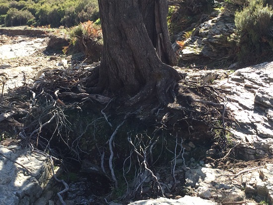 Exposed roots of Rhamnus persicifolia after the flood. Photograph by N. Sanna.